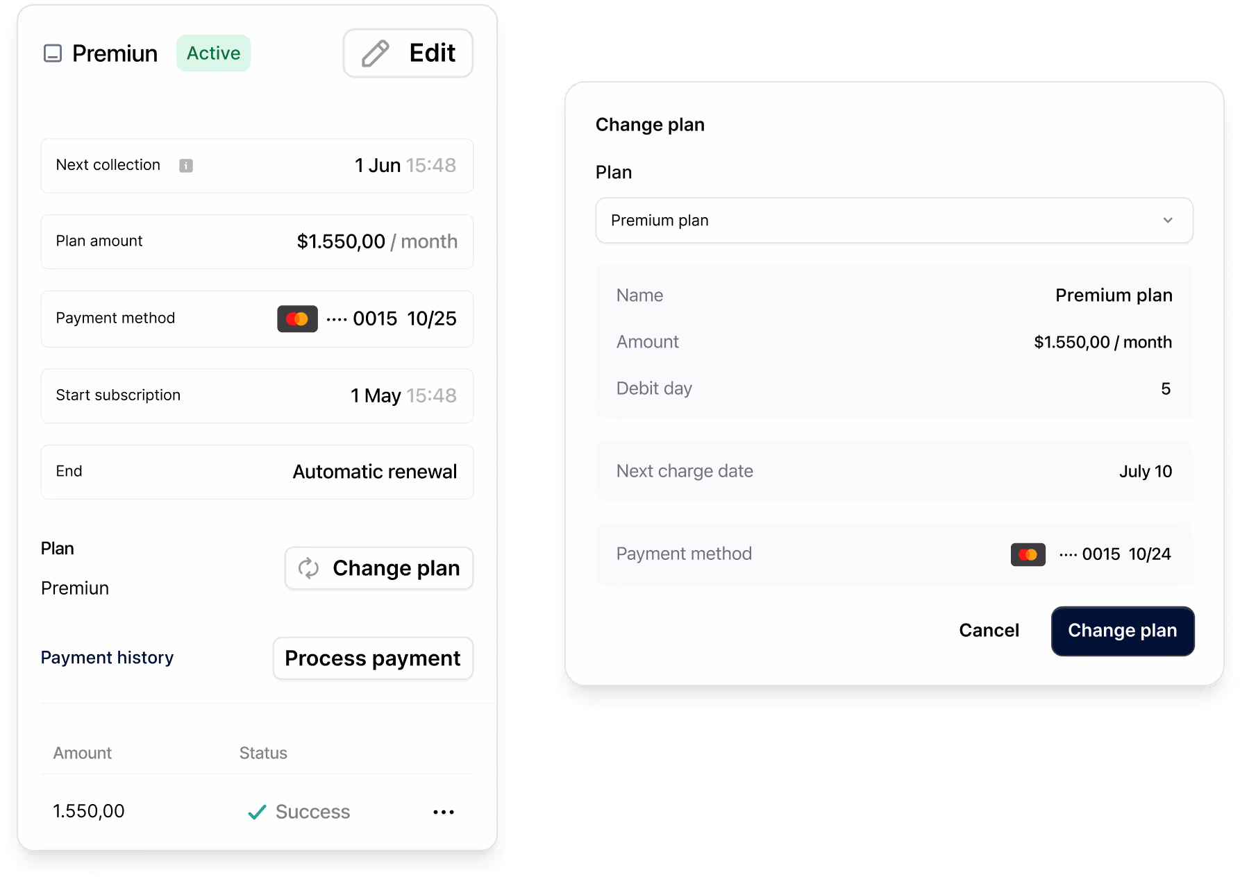 Yes. Set flexible billing dates, define custom cycles, and let customers upgrade/downgrade plans with optional proration.